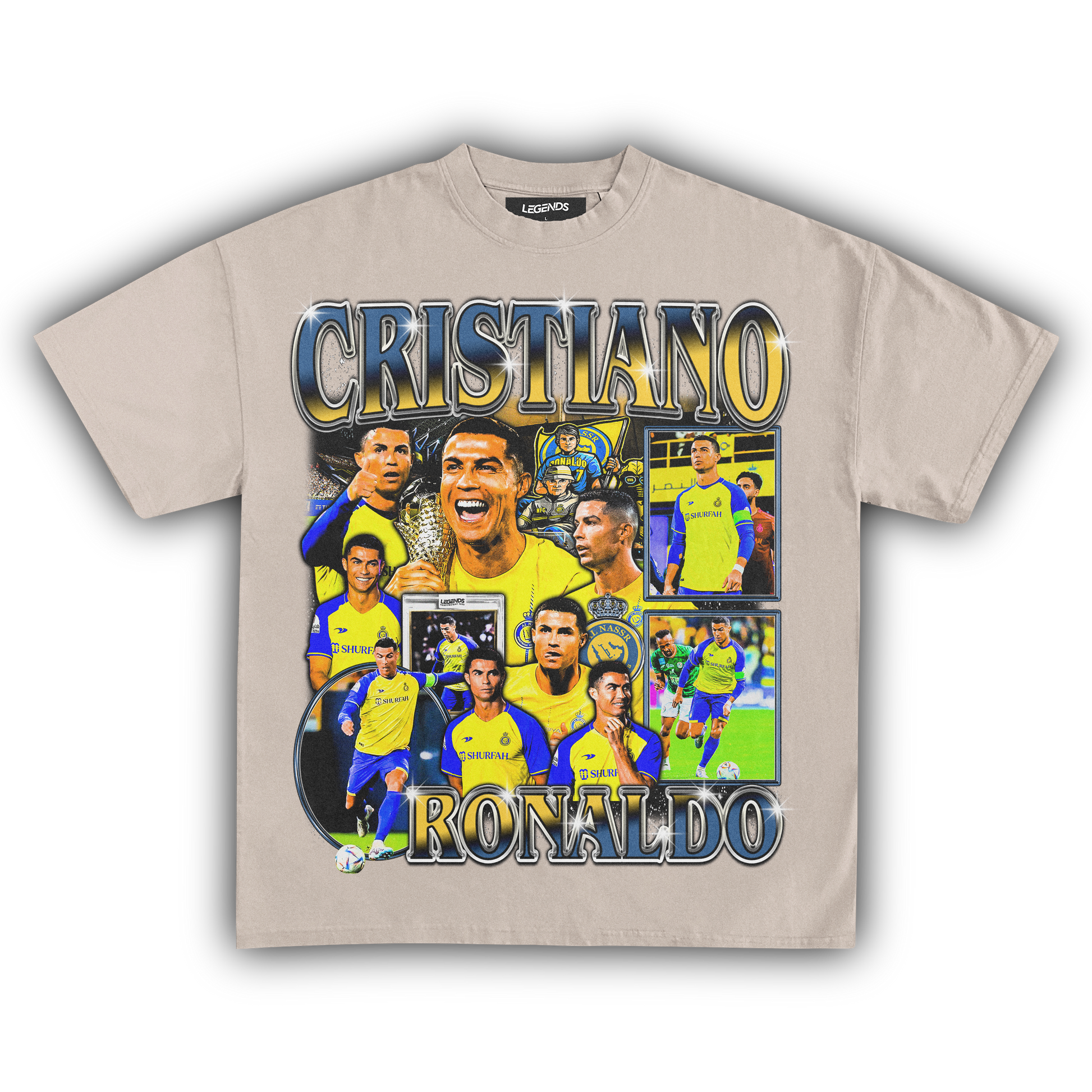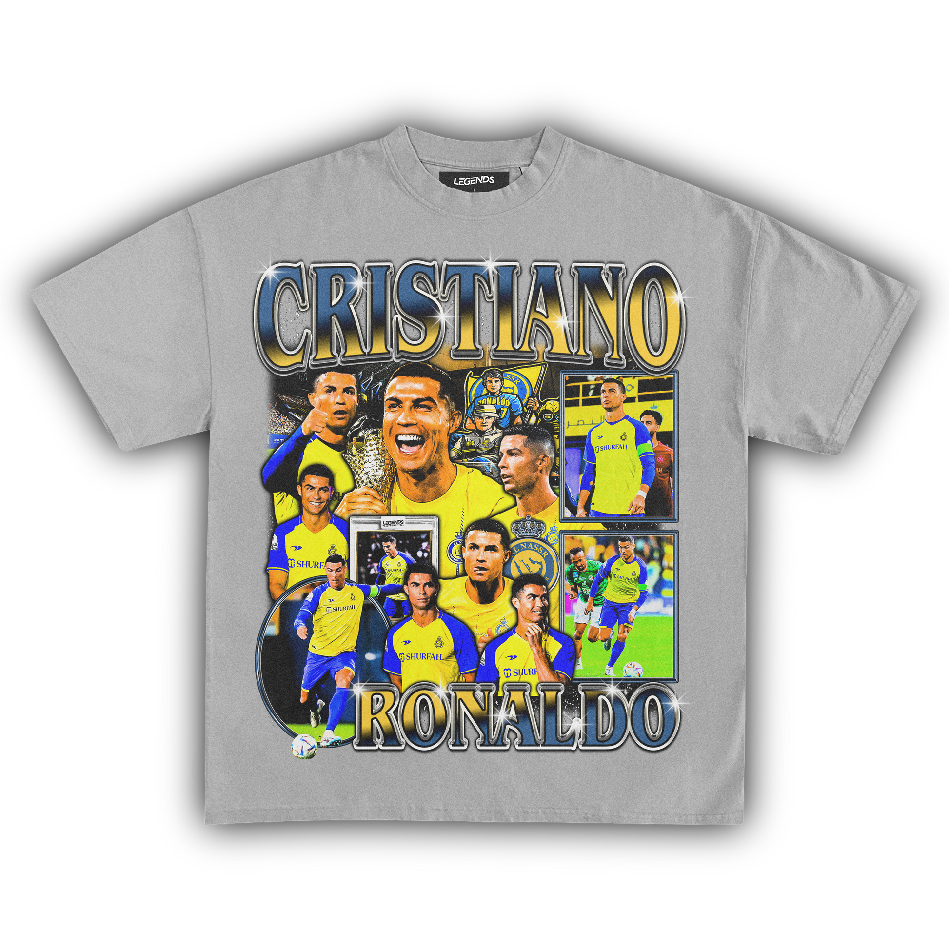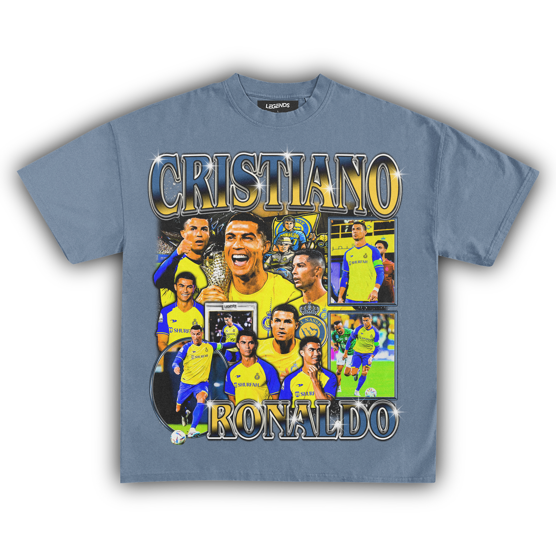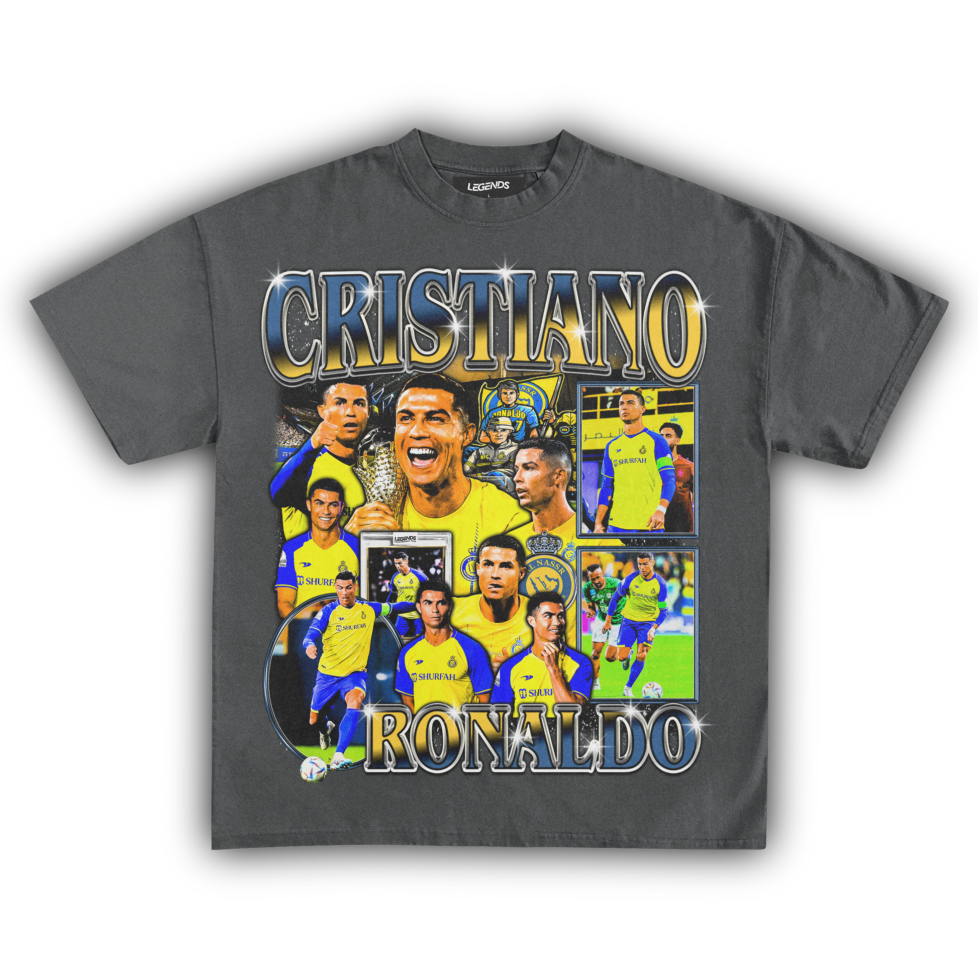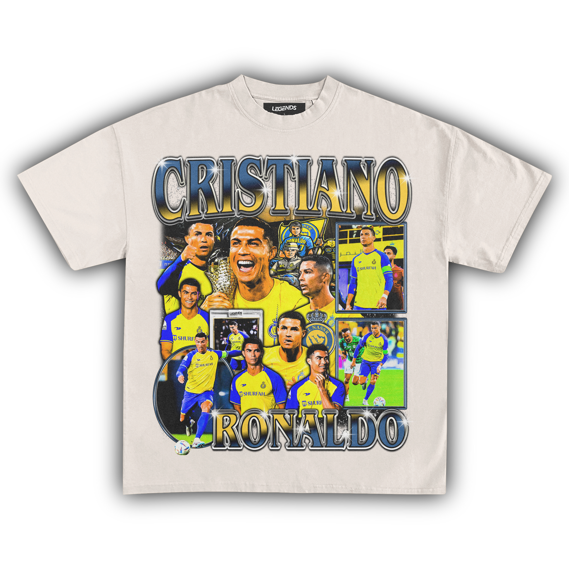 Be a game-changer in this unparalleled vintage designer luxury heavyweight style t-shirt featuring the living legend, Cristiano Ronaldo. Witness his new era with Al-Nassr and take part in a global phenomenon. When it comes to soccer stardom, few names ring louder than Ronaldo, proving that legends never fade.