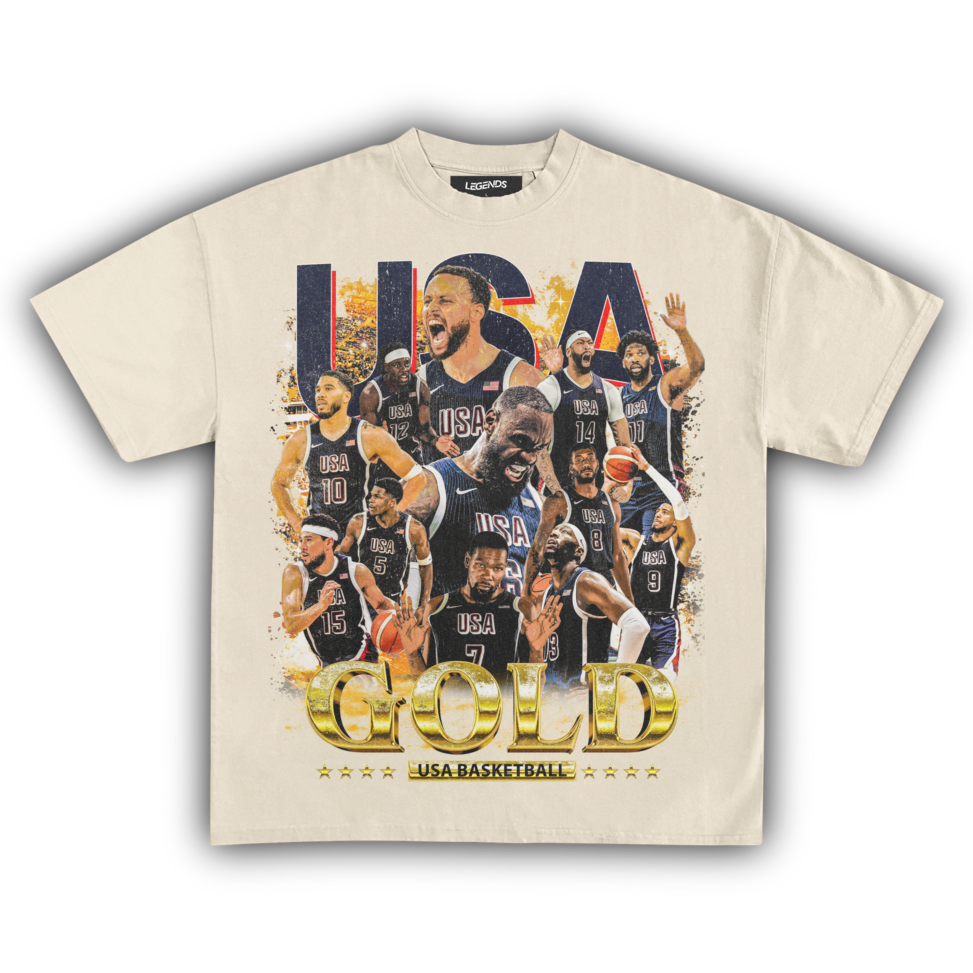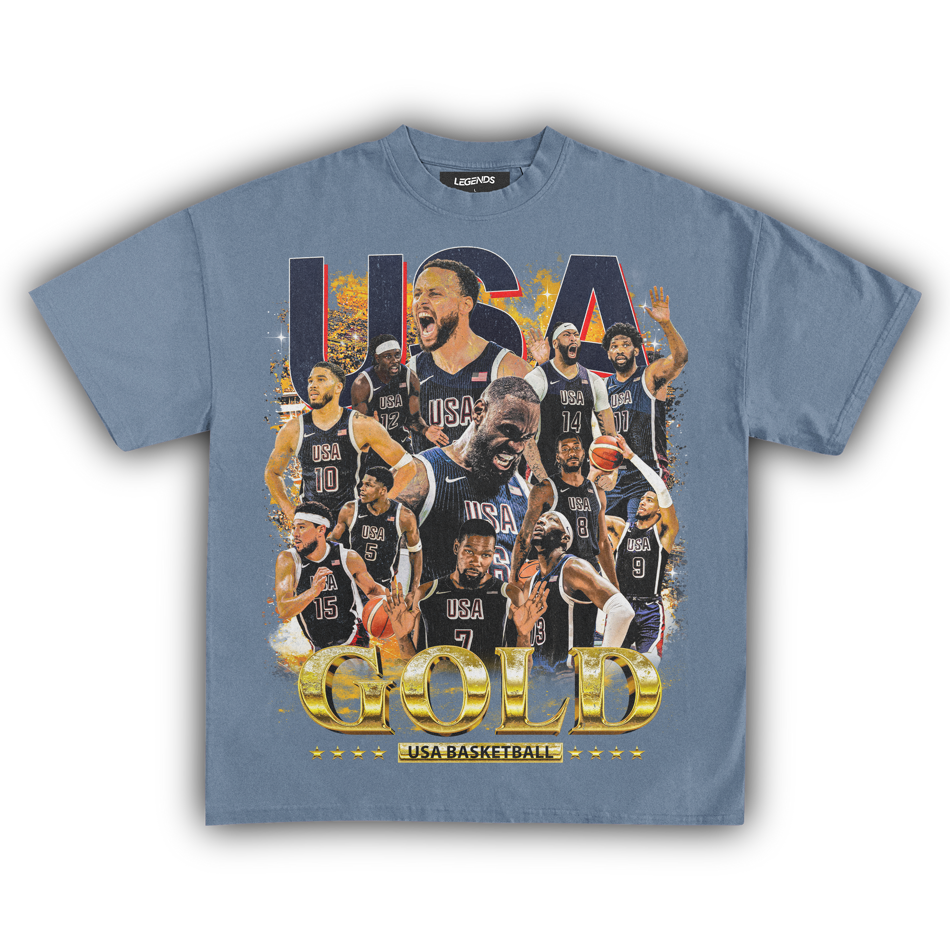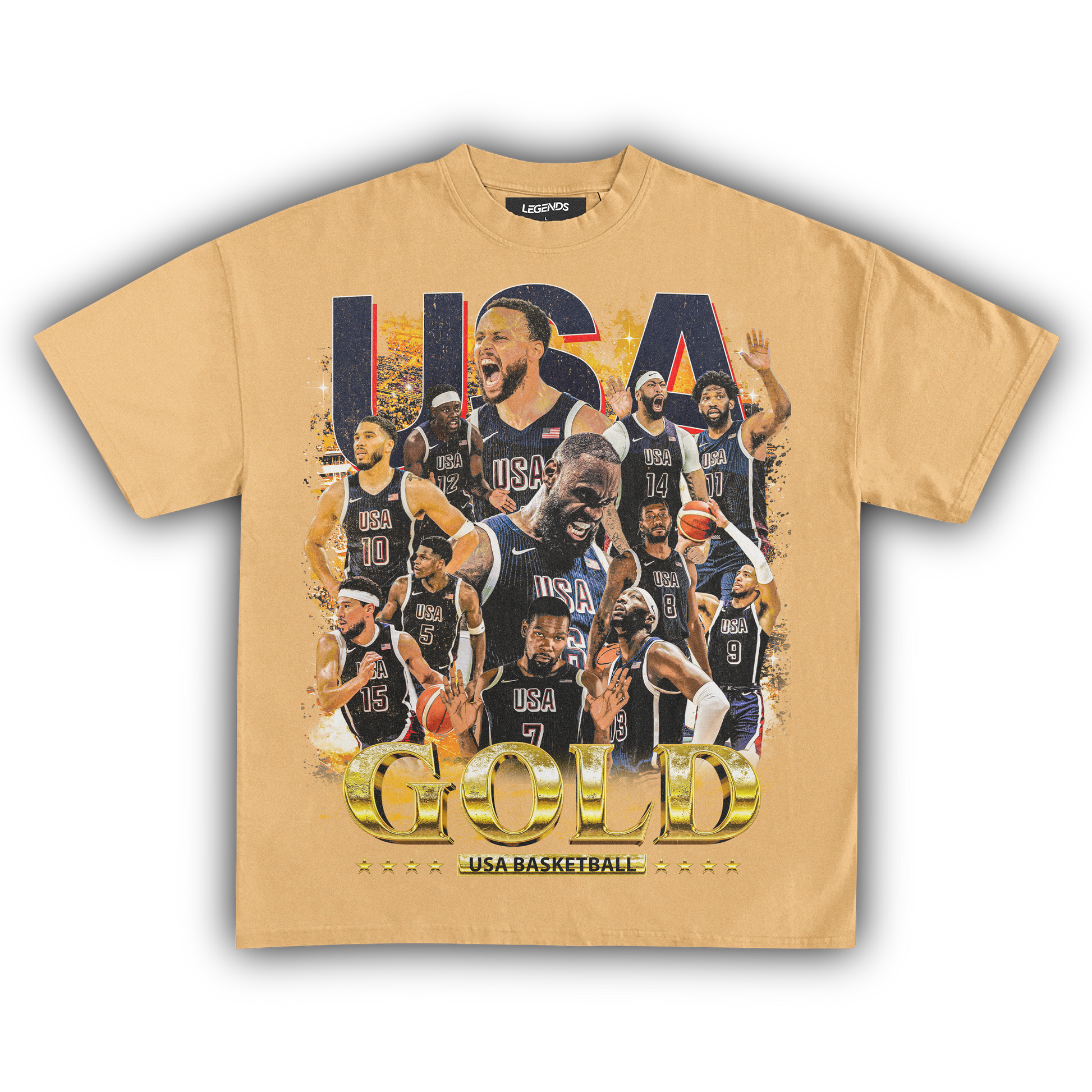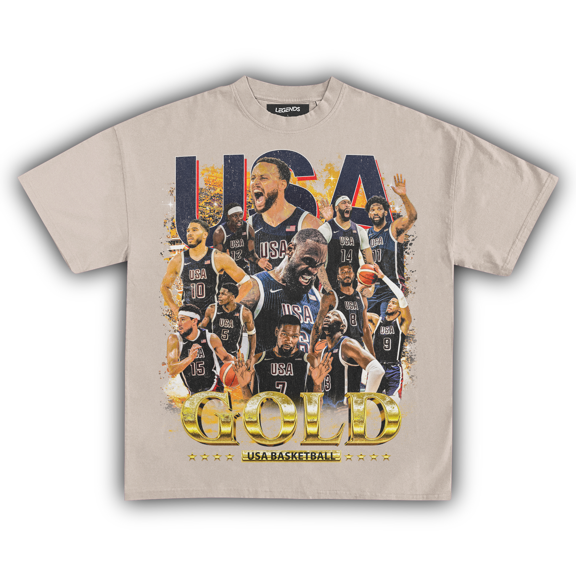 Celebrate the pinnacle of basketball excellence with our USA Men's Basketball Gold Medal Vintage Tee. This classic shirt pays tribute to the legendary 2024 gold medal victory with a vintage-inspired graphic that embodies the team's dominance on the court. Made from heavyweight 7.5 oz fabric for a robust and comfortable wear, it features a garment-dyed finish for that authentic retro look. The 1" thick collar and our loose relaxed fit ensure a streetwear edge that stands out. With a super high-quality DTG print, this tee brings the gold medal glory of the USA Men's Basketball team to life. Ideal for hoops enthusiasts and anyone who wants to sport their pride in American basketball supremacy.