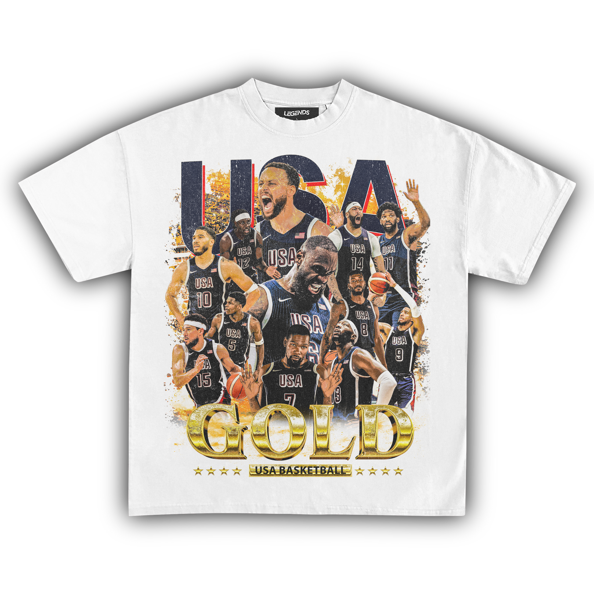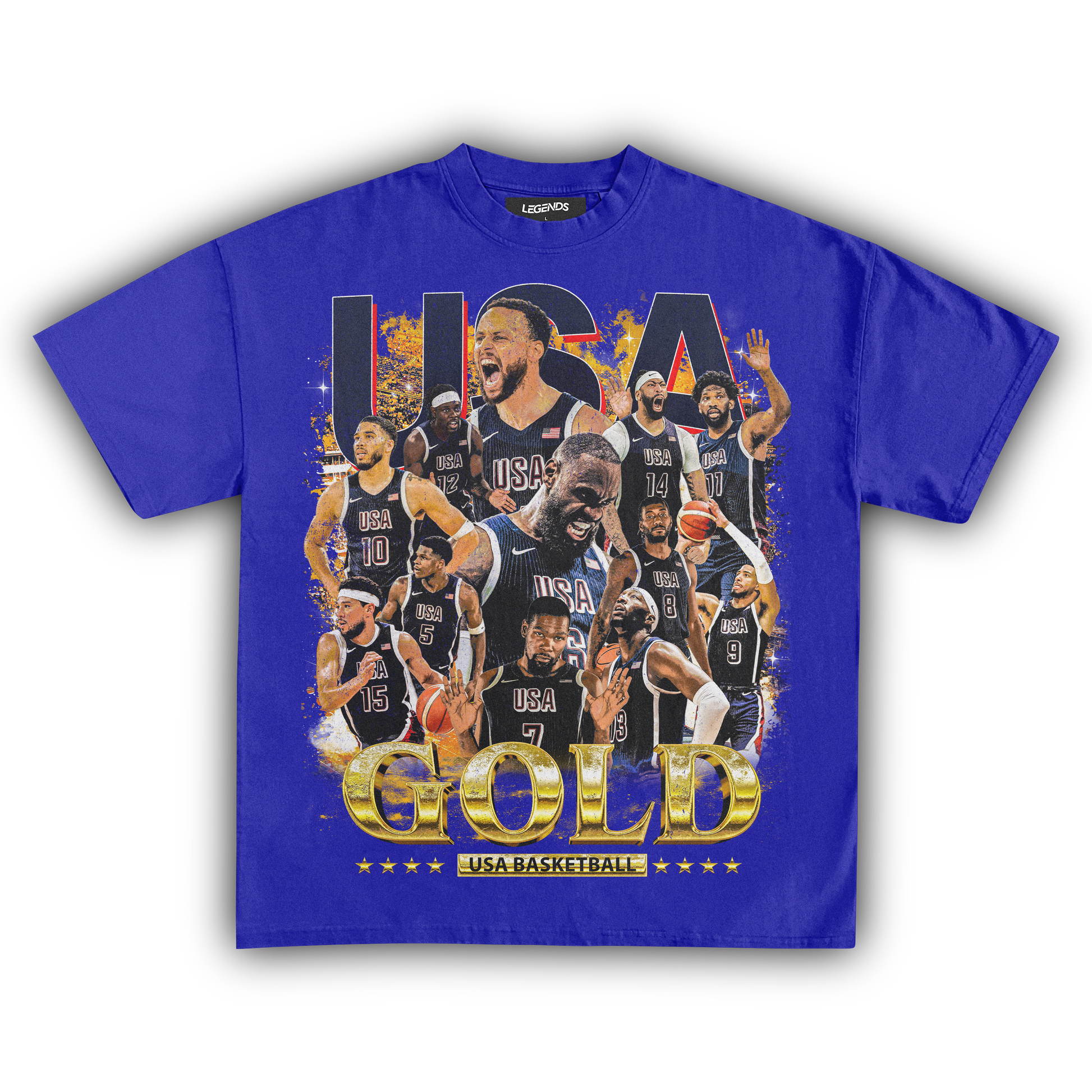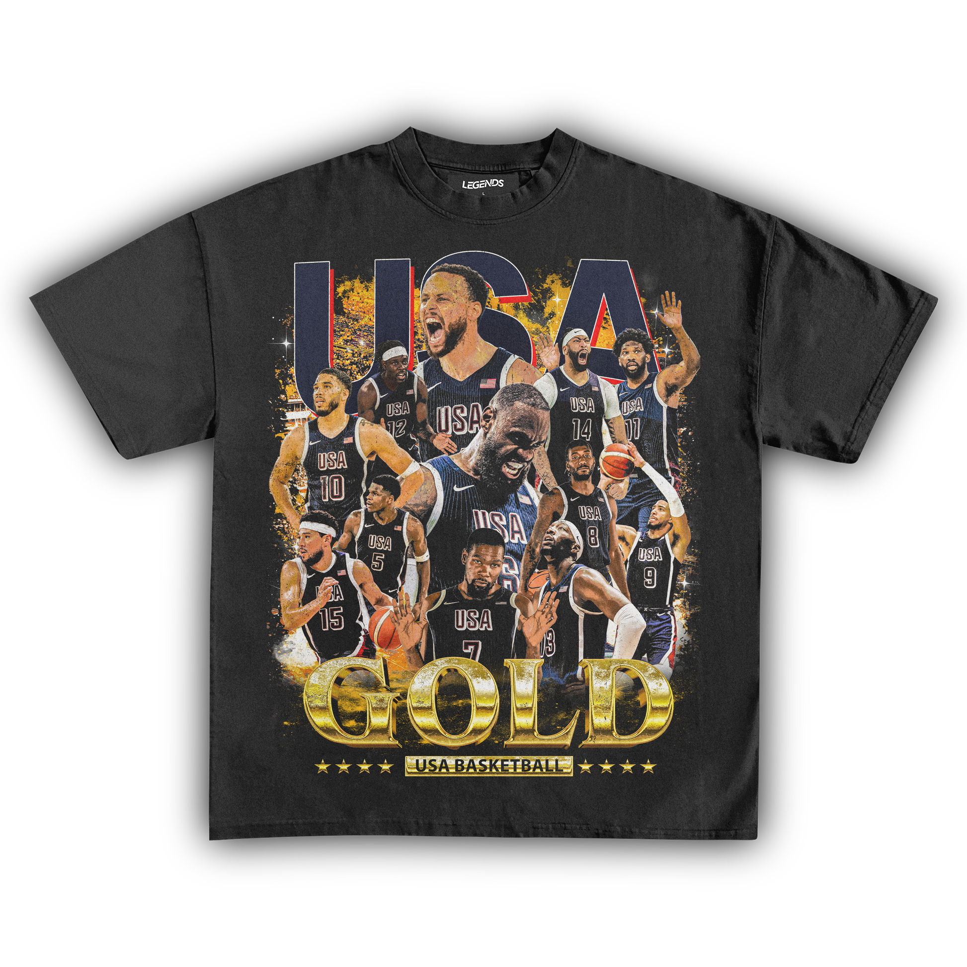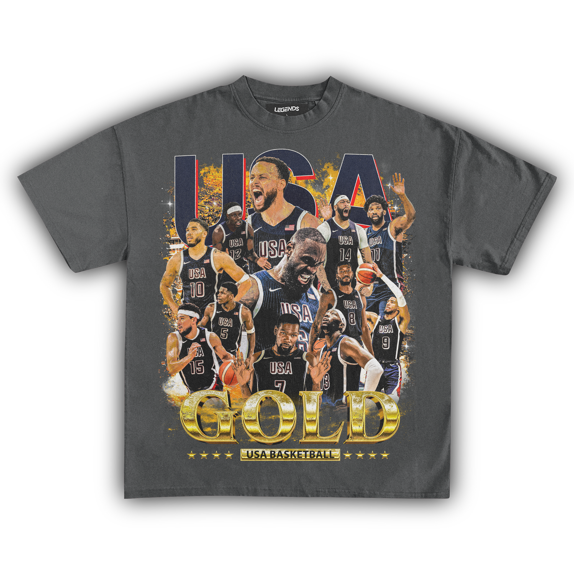 Celebrate the pinnacle of basketball excellence with our USA Men's Basketball Gold Medal Vintage Tee. This classic shirt pays tribute to the legendary 2024 gold medal victory with a vintage-inspired graphic that embodies the team's dominance on the court. Made from heavyweight 7.5 oz fabric for a robust and comfortable wear, it features a garment-dyed finish for that authentic retro look. The 1" thick collar and our loose relaxed fit ensure a streetwear edge that stands out. With a super high-quality DTG print, this tee brings the gold medal glory of the USA Men's Basketball team to life. Ideal for hoops enthusiasts and anyone who wants to sport their pride in American basketball supremacy.