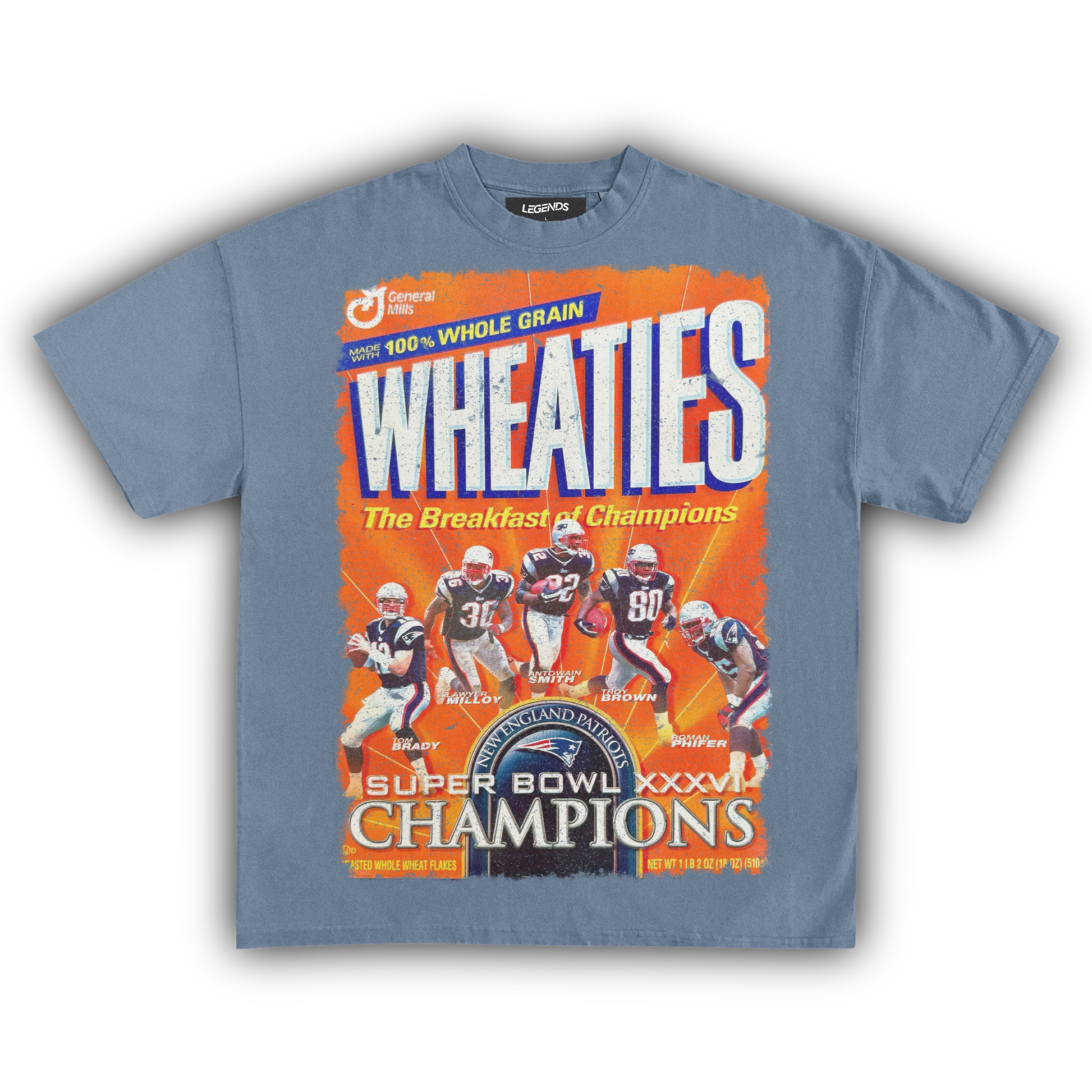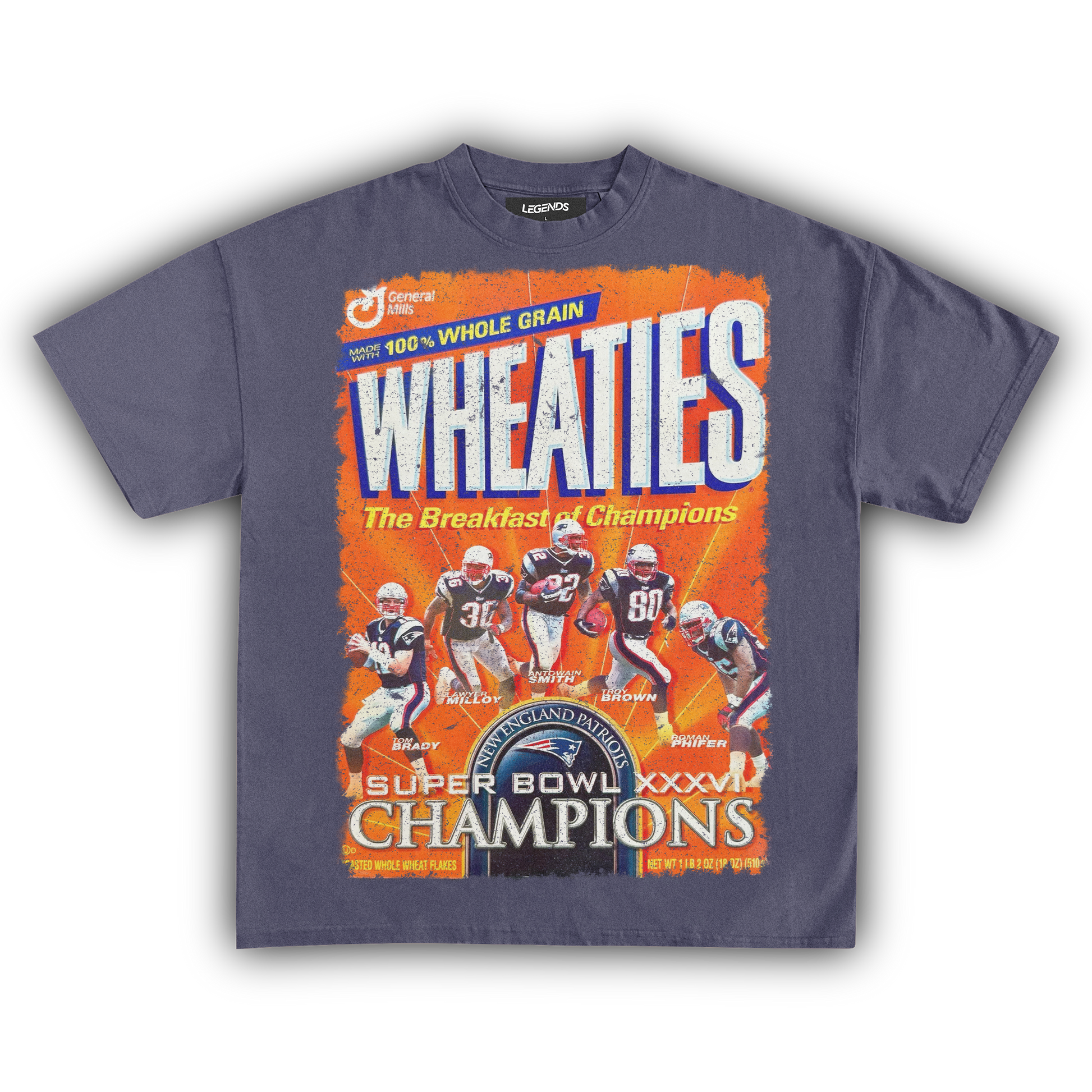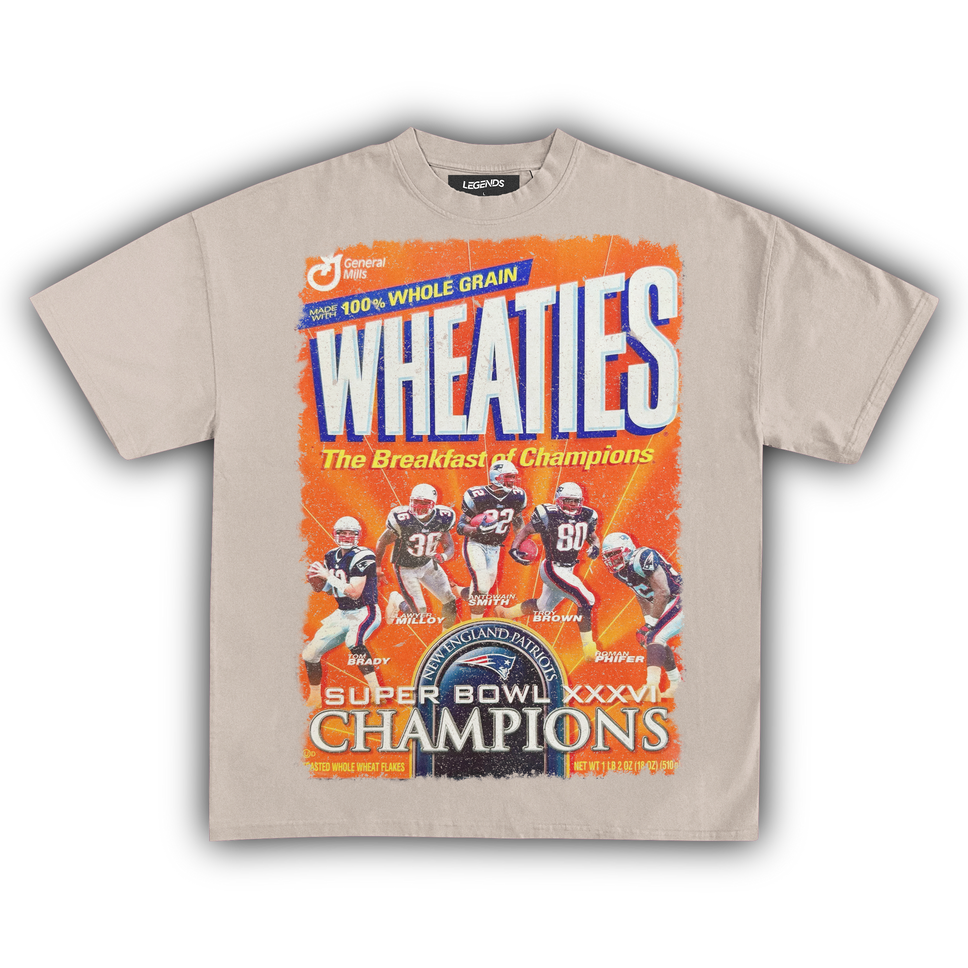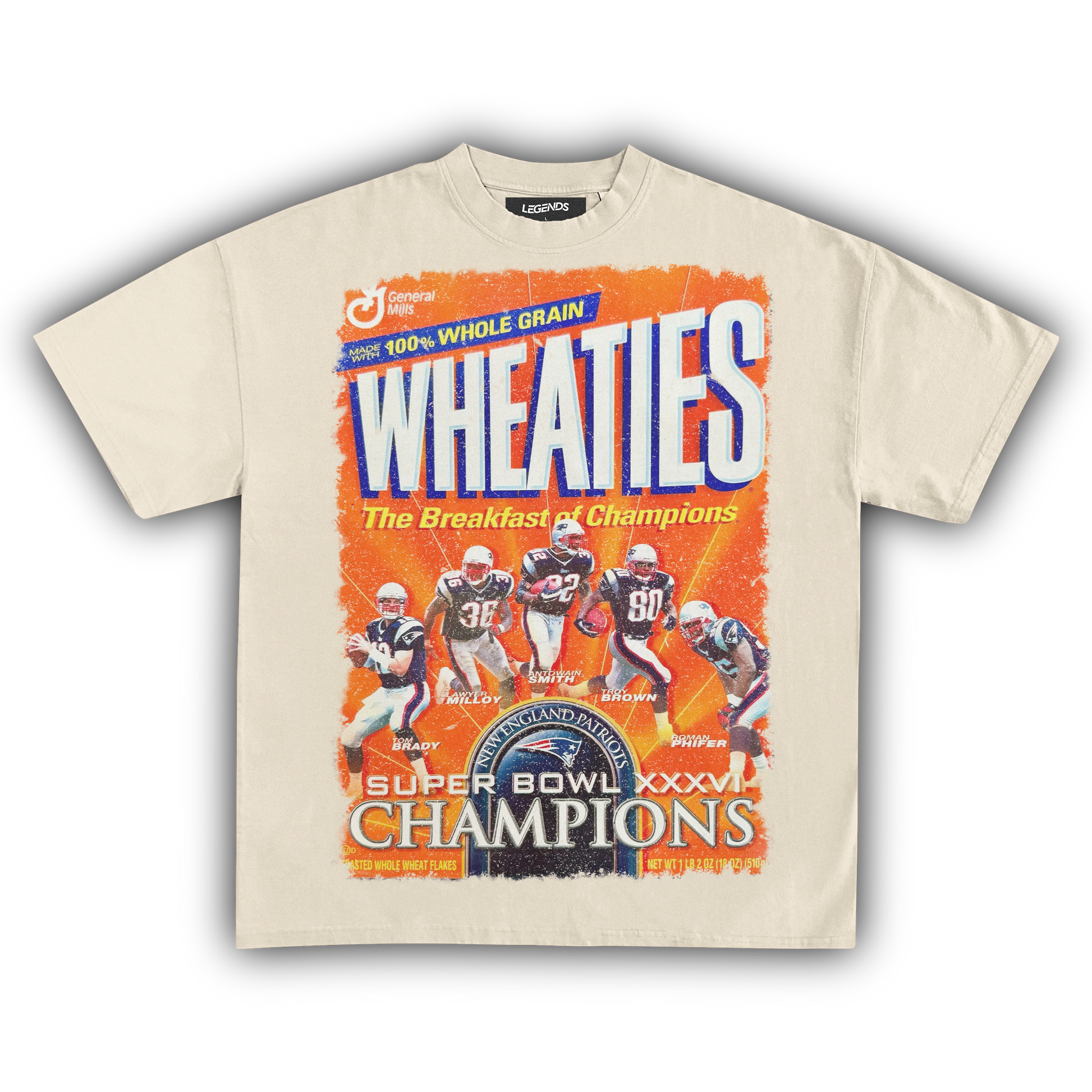 Celebrate the champions with our Wheaties New England Champions XXXVI 2002 Vintage Tee, marking the year they graced the iconic Wheaties box. Made from heavyweight 7.5 oz fabric for unbeatable durability and comfort, this tee features a garment-dyed, vintage-inspired look that radiates retro vibes. The 1" thick collar brings a gangster streetwear edge, while the oversized relaxed fit ensures you stay cool and laid-back. The super high-quality DTG print captures the 2002 Wheaties box graphic in stunning detail. Perfect for die-hard fans and collectors, this tee honors the legendary XXXVI victory and their place in football history.