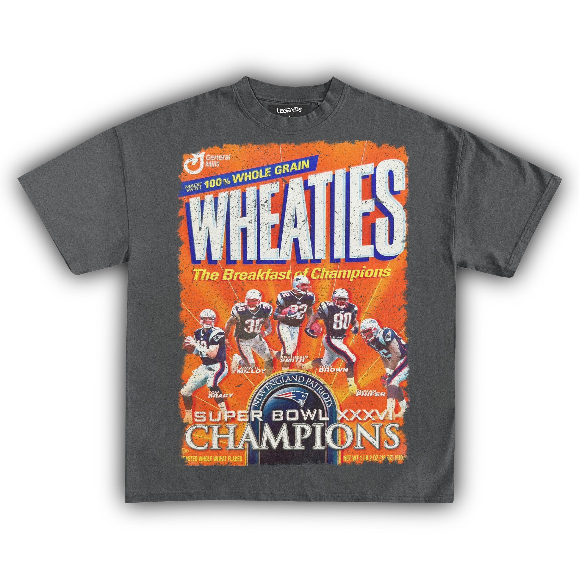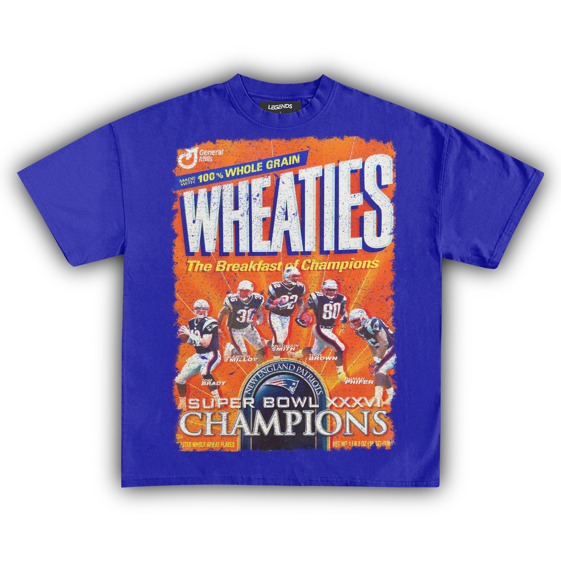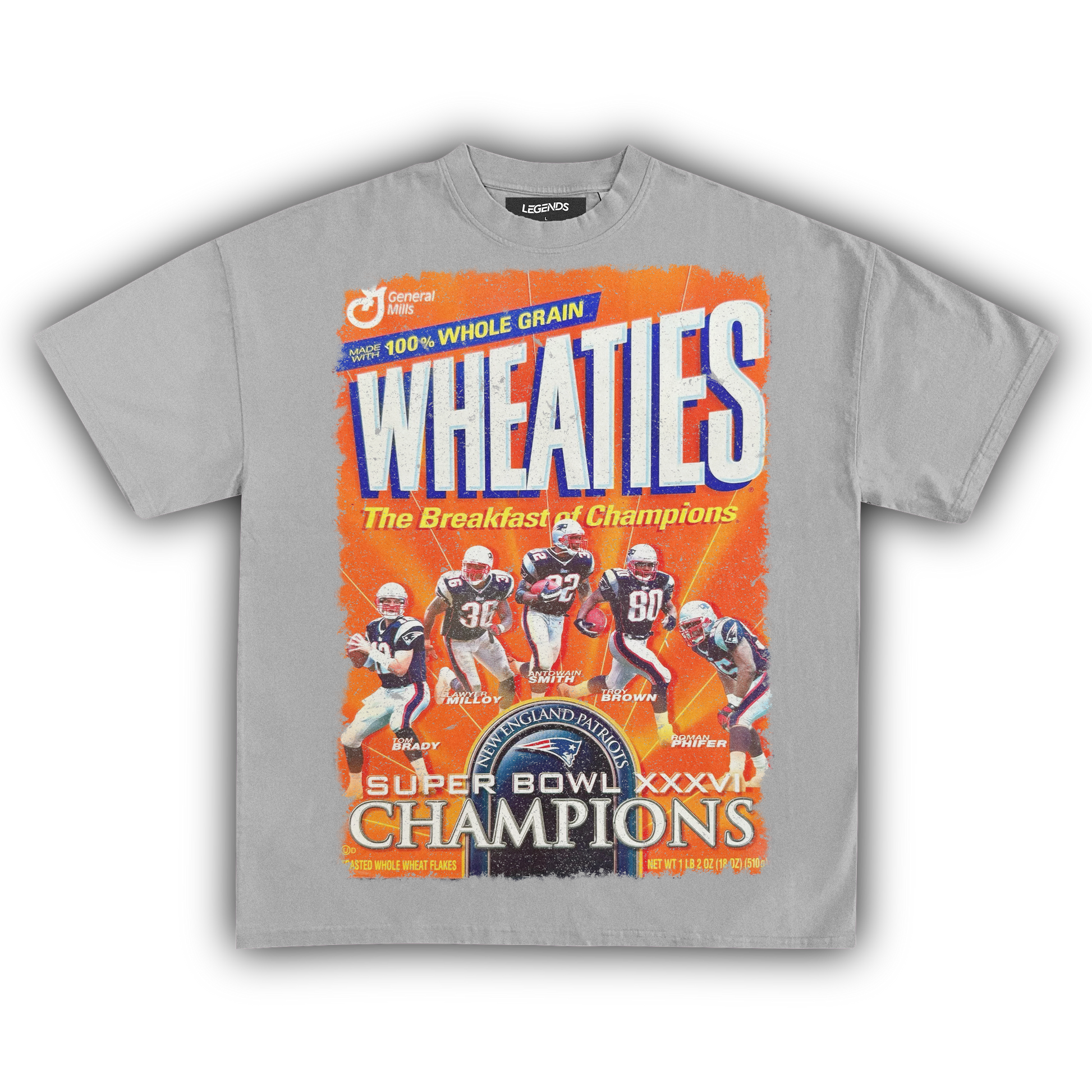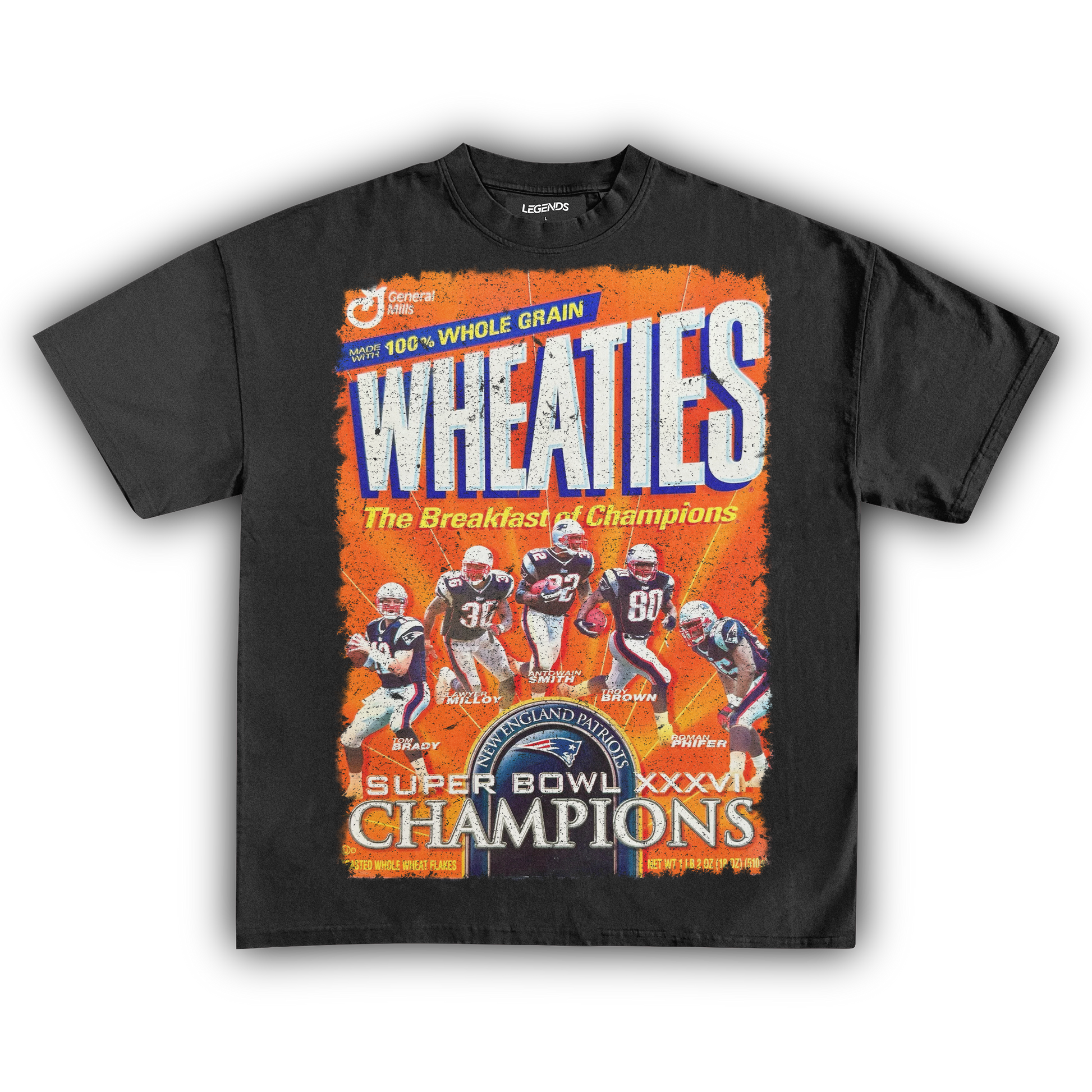 Celebrate the champions with our Wheaties New England Champions XXXVI 2002 Vintage Tee, marking the year they graced the iconic Wheaties box. Made from heavyweight 7.5 oz fabric for unbeatable durability and comfort, this tee features a garment-dyed, vintage-inspired look that radiates retro vibes. The 1" thick collar brings a gangster streetwear edge, while the oversized relaxed fit ensures you stay cool and laid-back. The super high-quality DTG print captures the 2002 Wheaties box graphic in stunning detail. Perfect for die-hard fans and collectors, this tee honors the legendary XXXVI victory and their place in football history.