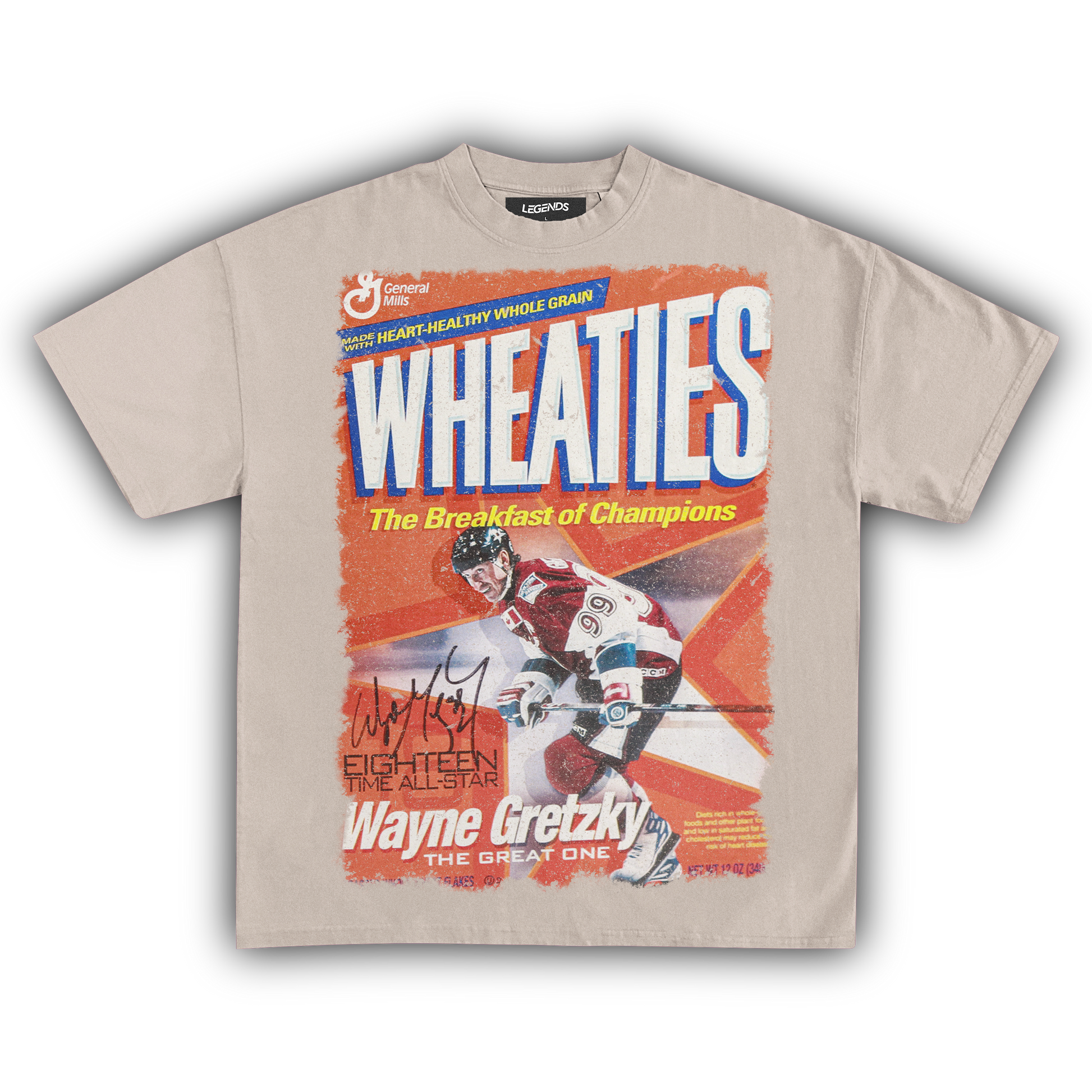 Show your admiration for "The Great One" with our Wheaties Wayne Gretzky 2003 Vintage Tee. Featuring the iconic Wheaties box cover from 2003, this shirt honors Gretzky's legendary status and his impact on hockey. Made from heavyweight 7.5 oz fabric and garment-dyed for a classic retro vibe, it combines durability with a vintage-inspired look. The 1" thick collar and oversized relaxed fit give it that streetwear edge, while the high-quality DTG print brings the graphic to life with style. This tee is a must-have for hockey fans and collectors who want to rep a piece of Gretzky's storied career.